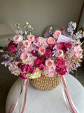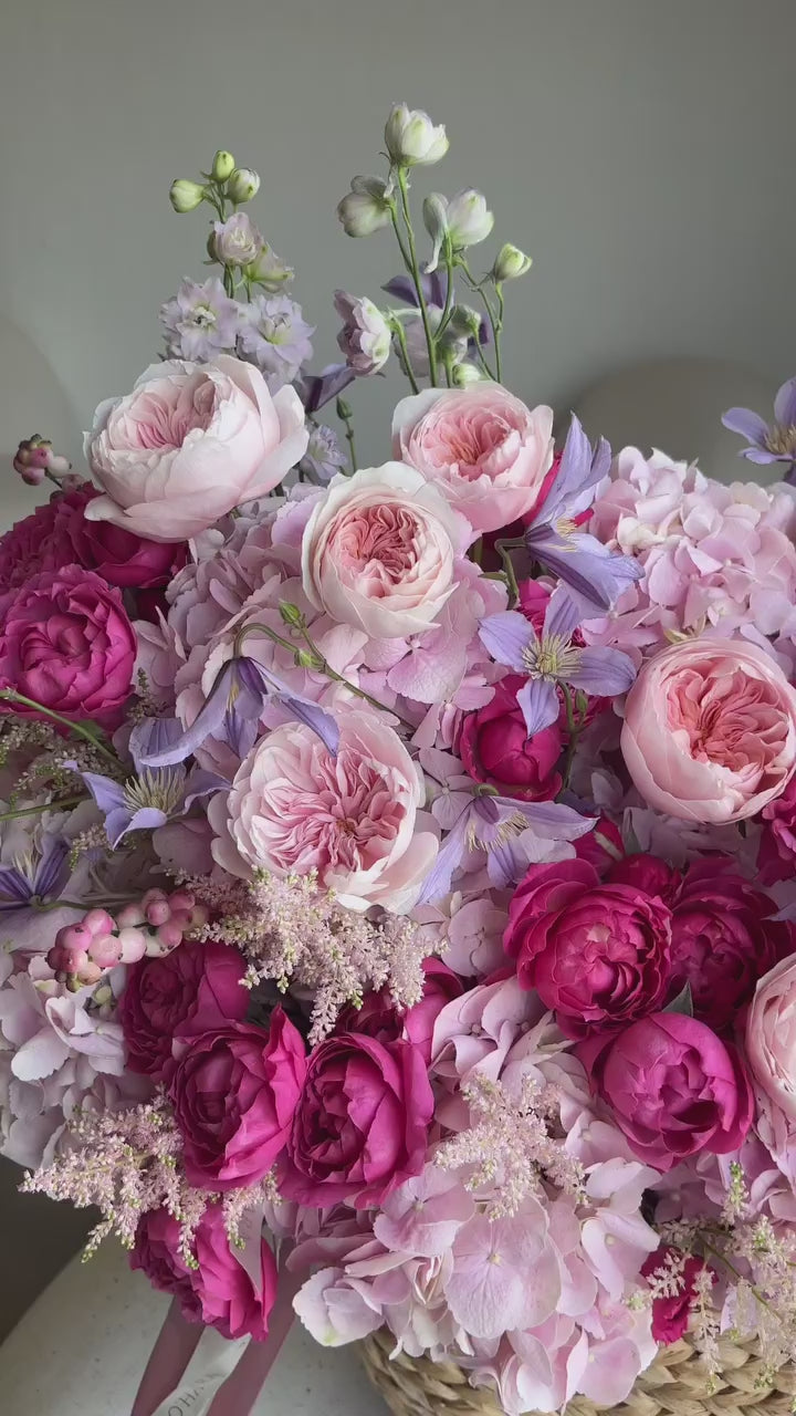 Luxurious abundance overflows in a spectacular garden-inspired basket featuring blush garden roses, vibrant fuchsia blooms, and delicate lavender accents that create a breathtaking masterpiece. Featuring coral-blush garden roses, hot pink garden roses, purple alstroemeria, pale pink hydrangeas, pale green hydrangeas, lavender matthiola stock, and champagne dried astilbe, this lavish arrangement celebrates nature's finest through impressive volume and rich color harmony. Presented in a charming woven basket with coordinating ribbon detailing, it's perfect for grand celebrations, luxury weddings, milestone events, or as an extraordinary centerpiece that captivates and inspires.