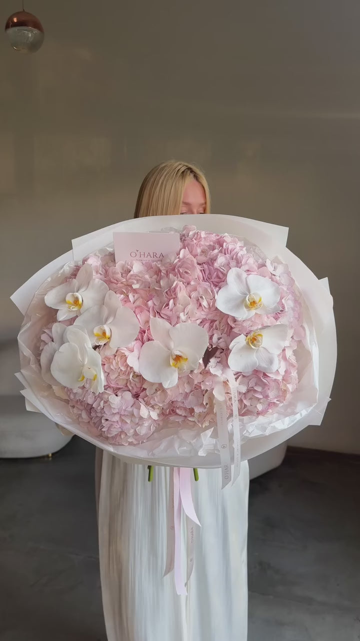 Luxurious opulence unfolds in an abundant display of soft pink hydrangeas crowned with elegant white phalaenopsis orchids that create a cloud-like masterpiece. Featuring voluminous blush hydrangeas and pristine white orchids, this generous arrangement showcases the beauty of simplicity through exceptional quality blooms and dramatic volume. Wrapped in sophisticated translucent paper with elegant ribbon accents, it's perfect for grand celebrations, luxury weddings, milestone events, or as an unforgettable gift that makes a breathtaking statement of elegance and refinement.