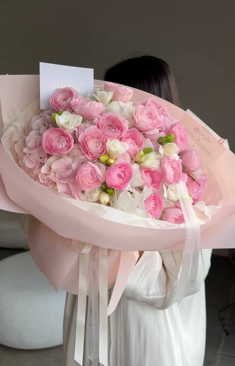 Charming beauty radiates through a delightful collection of pink and white ranunculus blooms nestled among soft blush hydrangeas that create a playful yet sophisticated aesthetic. Featuring vibrant pink ranunculus, ivory freesia, and pale pink hydrangeas, each carefully selected stem showcases the distinctive layered petals and cheerful spirit of these beloved spring blooms. Wrapped in elegant translucent paper with coordinating ribbon detailing, it's perfect for spring celebrations, birthdays, romantic occasions, or as a joyful gift that brings warmth and happiness to any moment.