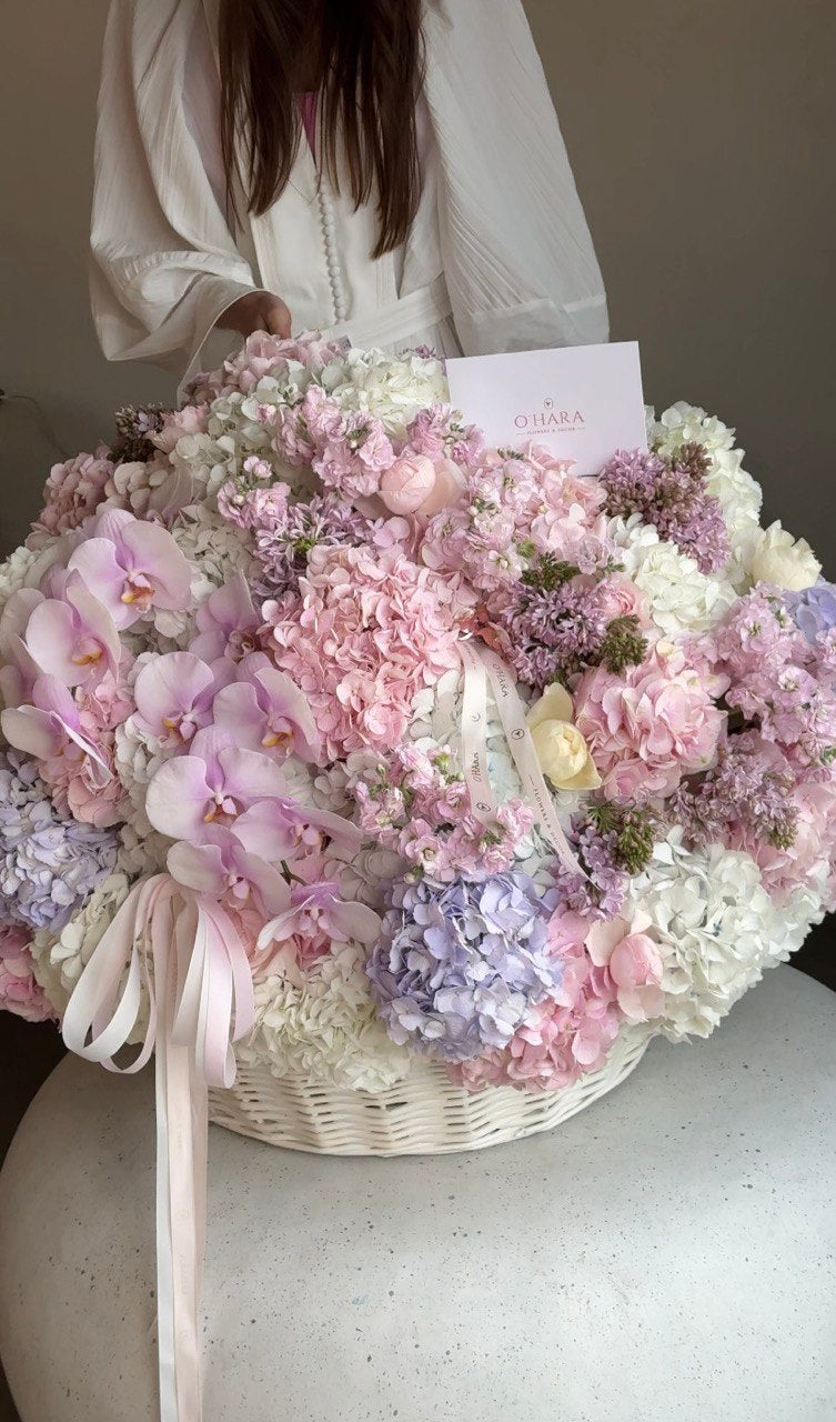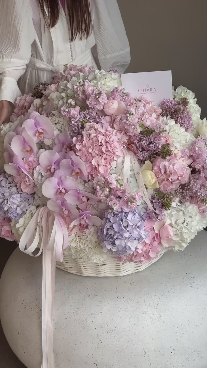 Enchanting luxury blooms in an extraordinary basket overflowing with soft pastels featuring delicate pink orchids, lavender hydrangeas, and blush peonies that create a dreamy garden paradise. Featuring pale pink phalaenopsis orchids, blush peonies, pink hydrangeas, lavender hydrangeas, white hydrangeas, ivory carnations, lavender matthiola stock, and dusty mauve spray roses, this magnificent arrangement celebrates romantic beauty through impressive volume and serene color harmony. Presented in an elegant white woven basket with coordinating ribbon detailing, it's perfect for luxury weddings, grand celebrations, milestone events, or as a breathtaking centerpiece that embodies grace, elegance, and unforgettable charm.
