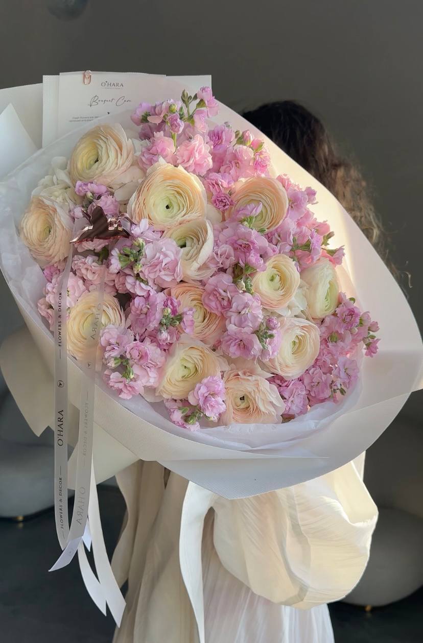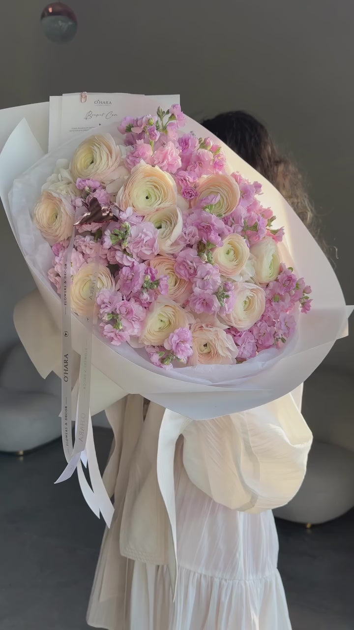 Delicate beauty unfolds in a charming blend of creamy ivory ranunculus and soft pink matthiola stock that creates a whimsical, romantic composition. Featuring cream-to-blush gradient ranunculus and lavender-pink matthiola stock, each premium stem showcases distinctive layered petals and delicate hues that evoke spring gardens and gentle sophistication. Wrapped in elegant translucent paper with coordinating ribbon accents, it's perfect for spring celebrations, romantic gestures, intimate gatherings, or as a thoughtful gift that conveys tenderness and grace.